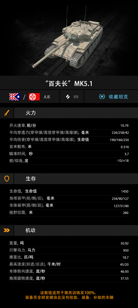 “百夫长”MK5.1拥有226/258/42的平均穿深,单发伤害虽属常规水平,但凭借5.56秒的装填时间,使其具备了出色的持续输出能力。0.316的百米精度使其在中远距离交战中能够稳定命中目标,有效打击敌人。该车拥有45千米/时的前进极速,配合18.7马力/吨的推重比,使其具备一定的转场与战术应变能力。