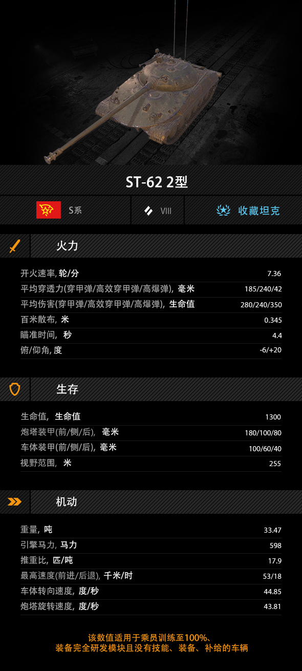 ST-62 2型的平均穿透力为185/240/42,单发伤害280,拥有出色的炮控性能,在中远距离交战中表现稳定。最高前进速度可达53千米/时,车体转向速度为44.85度/秒,具备优秀的转场与侧翼支援能力。擅长地形作战的车长们千万不要错过ST-62 2型。